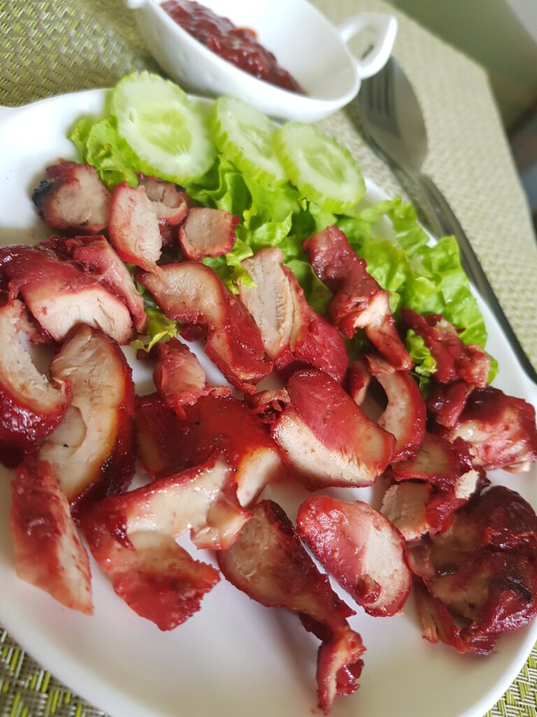 As the name suggests, this is a recipe having slight Chinese origins, with a touch of Indonesia in the form of chilli sambal. A very simple recipe to make and of course eat 😊. It looks very pretty when served. Serve this roast chicken as a starter.