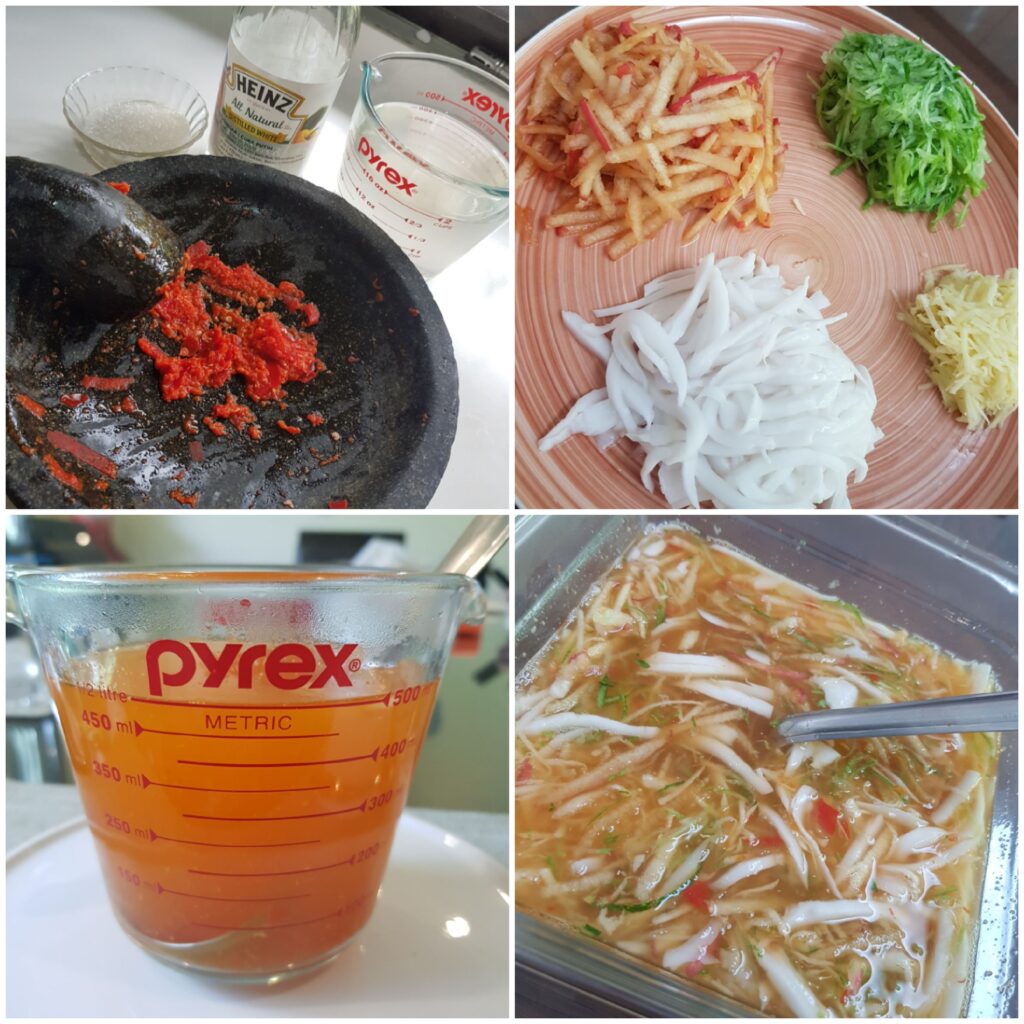 Here in Indonesia, people love Asinans and Rujaks. Rujaks are cut fruits and raw vegetables, served with a thick palm sugar sauce (will put up recipe soon). An Asinan has fruit or vegetable, which are marinated in a tangy, spicy sweet syrup and sort of pickled. These can be bottled and kept upto 2 weeks, depending on the fruits and vegetables used. Asinans vary from region to region. Todays recipe is ASINAN SERUT (Grated fruit Asinan).