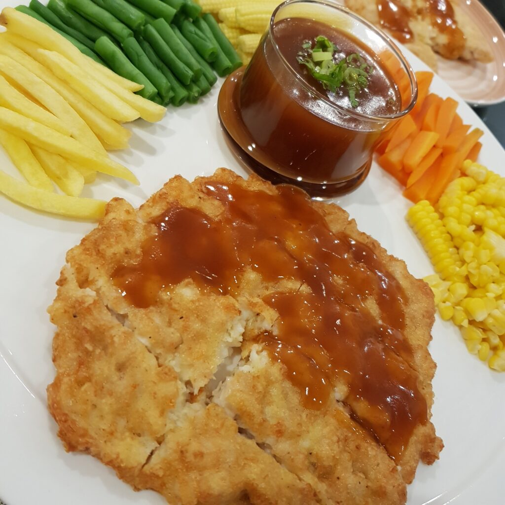 - Serve on a platter with the sauce, french fries, and steamed vegetables.