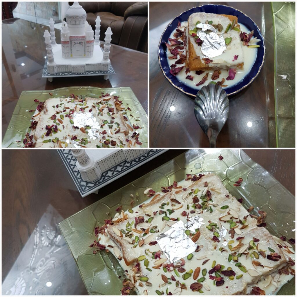 Any Indian food lover, especially those who have a sweet tooth, will have definitely tasted this amazing dessert at some point in their lives. This sinfully rich dish has paved its way down the Mughal era, with its route passing through the courts of the nawabs and royal households too, which is why it has an important place in wedding menus and is also very popular during the Ramzan festival, second only to the amazing sheer khurma. This elaborate-looking dish is actually very simple to make, needing just a few ingredients. Many families have their own version of this dish. Some serve it chilled, some at room temperature. Even the way it is served varies from region to region. The Hyderabadi people call it Double Ka Meetha, because of a type of milk bread that they use which literally swells to double its volume when soaked. The bread is always fried first till golden and then soaked in a warm saffron syrup. Once the bread slightly softens up, it is topped with a rich rabri and nuts. This wonderful marriage of flavours, which is a sheer delight in gastronomy, is India’s delicious answer to the bread pudding of the Western world. The simpler Sindhi version of this dessert is known as chash ji dabroti. It was a standard once-a-week dish in our home during winters, which my mom made on most Saturdays. Basically the bread was fried until golden, then dunked in a warm sugar syrup flavoured with saffron and cardamoms. My grandmother, Amma, loved this dish so much that she always asked for second helpings, with me not far behind. The Sindhi version does not include rabri. Today I will share with you my version of the recipe. Enjoy it, though this rich dessert will make calorie-conscious people think twice. Do try a small portion. Shahi Tukde Ingredients for the Rabri Method to Make Rabri Ingredients for Sugar Syrup Method Ingredients for the Bread Base Method to Fry and Assemble