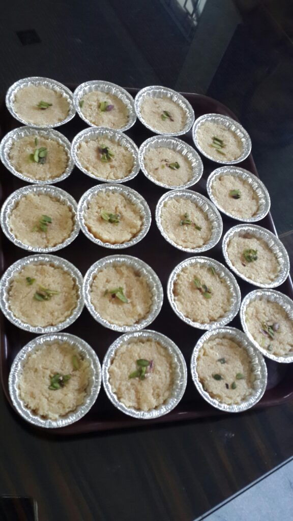 Call it semolina, sooji, rawa, or cream of wheat, this is an important must-have in almost all Indian pantries and even in the Middle East. Be it savoury or sweet, most Indian families will dish out delicious meals made of sooji. Upma, a savoury dish, calls for different ingredients depending on which region it is coming from, but the end result is almost always a creamy, silken, semi-porridge-like consistency, easy on the stomach. In Maharashtra it includes potatoes, carrots, and beans and is normally served with sweet curd and is part of naashta (breakfast), whereas in the South it is served with a spicy sambhar and coconut chutney and is served as tiffin. Any which way, upma is relished throughout India. Another popular dish made out of sooji is the rawa dosa, available in most Udupi restaurants all over India. This dosa brings back memories of another day, when we, as young children, used to accompany our parents to the Sai Baba temple at Swargate, Pune. Not very far from the temple was this restaurant called Triveni, the pioneer in serving this crisp dosa in Pune, way back in the 1970s. This crisp dosa (crepe), sprinkled with chopped green chillies and chopped onions, served with cold coconut chutney and sambar, was our weekly treat most Sundays. Beautiful memories. Anyone who has lived in Maharashtra and who has seen and been a part of the Ganpati Utsav will definitely vouch for the melt-in-your-mouth sooji prasad that is distributed along with modaks at all the beautifully decorated stalls. My earliest memory of having this amazing prasad is of having it every year at my mamaji’s shop, Deluxe Decorators, where the Ganesh idol was kept for 11 days and then taken for immersion at Bund Garden. I remember a Maharashtrian lady making it, and when this huge pot was opened after the aarti for distribution, the aroma was mouth watering. Today I share with you this recipe, which is a favourite with my children. Sooji Halwa, Prasad Ingredients Method Truly ambrosia, or food for the gods.