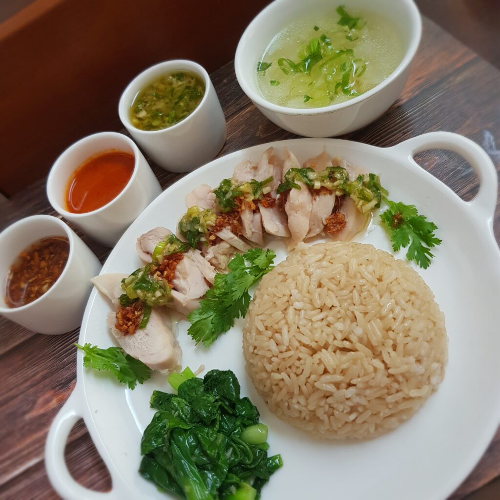 Master the legendary Singaporean Hainanese Chicken Rice at home with this streamlined, skinless modification. This complete guide features tender brined chicken, seasoned jasmine rice, and the essential trio of garlic oil, spring onion ginger oil, and spicy chili sauce.