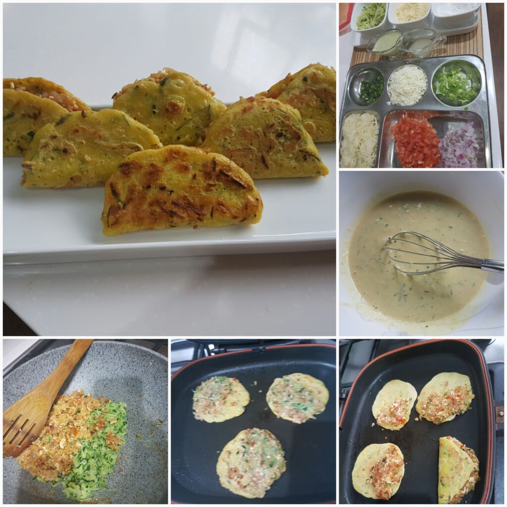 nother vegetable which has recently been introduced to Indian cuisine is zucchini. This vegetable resembles a cucumber in appearance but has a firmer texture and seeds which are very tiny and almost invisible. It is an emerald green colour and comes from the family of squash. The only difference is that it is harvested quite early, when it reaches a length of about 25 cm, to prevent it from losing its taste. This vegetable, which is a storehouse of nutrients, adapts itself very well to any cuisine, sweet or savoury. Be it a zucchini fritter or just simply tossed with a few herbs and roasted, it makes a great side dish and is very healthy. Today I would like to share with you a snack made with shredded zucchini which I have adapted to an Indian taste. This snack can be pre-made and then reheated and served. The use of oil is very minimal in this snack, and it is a good option for those of you trying to avoid deep-fried snacks. We as mothers know that children are fussy when it comes to eating vegetables. I learnt how to play hide and seek with vegetables in many forms when my children were growing up, sometimes in parathas, sometimes in cakes and idlis. There were beetroot parathas, carrot Sindhi kokis, or spinach idlis, etc. But nowadays young mothers are more health conscious and train their children from an early age to eat healthy. Zucchini is definitely a vegetable which should occupy a permanent space in your vegetable drawer. Ingredients Method