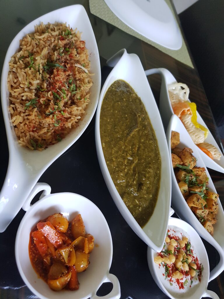 A complete Sindhi meal with basar jo pulao (onion pulao), sookha aloo (potatoes with dry spices), boondi raita, some fryums, and onion-carrot achar.