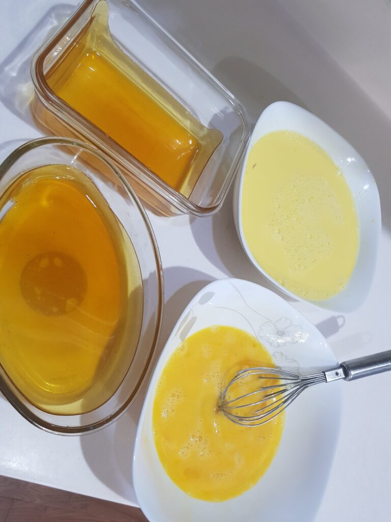 - Beat the four eggs lightly and add to the cooled milk mixture. Mix well and strain this mixture.