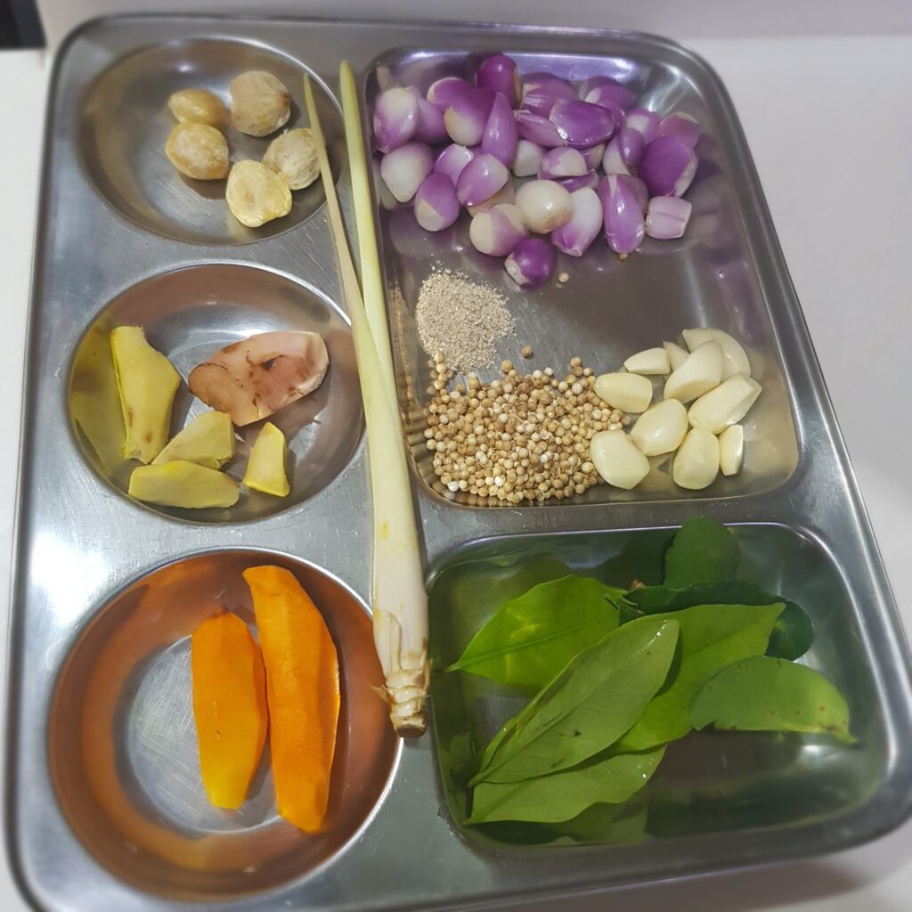 - Add the lemongrass root, bay leaves, and kaffir lime leaves. Sauté till the herbs release their fragrance.