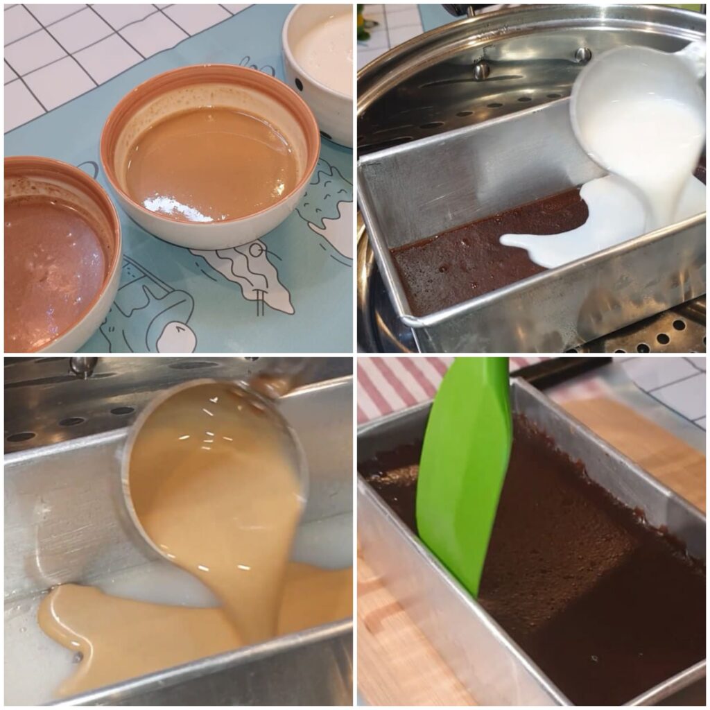 Heat a steamer, when its hot, place the container in it, and put 2 ladles of chocolate batter. Cover and steam for 7 mins. Next add 2 ladles of white batter. Steam for 7 mins. Now add 2 ladles of coffee batter. Steam for 7 mins. Keep alternating flavours till the last layer. Steam for 25 mins.
