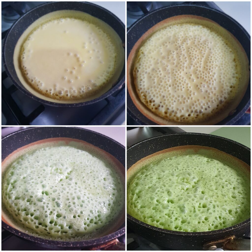 (Note: I poured one cup of batter for each martabak. I added green colour in one and yellow colour to another. Its flexible. Can omit colours too.)