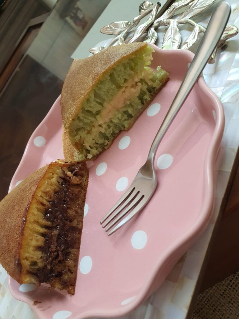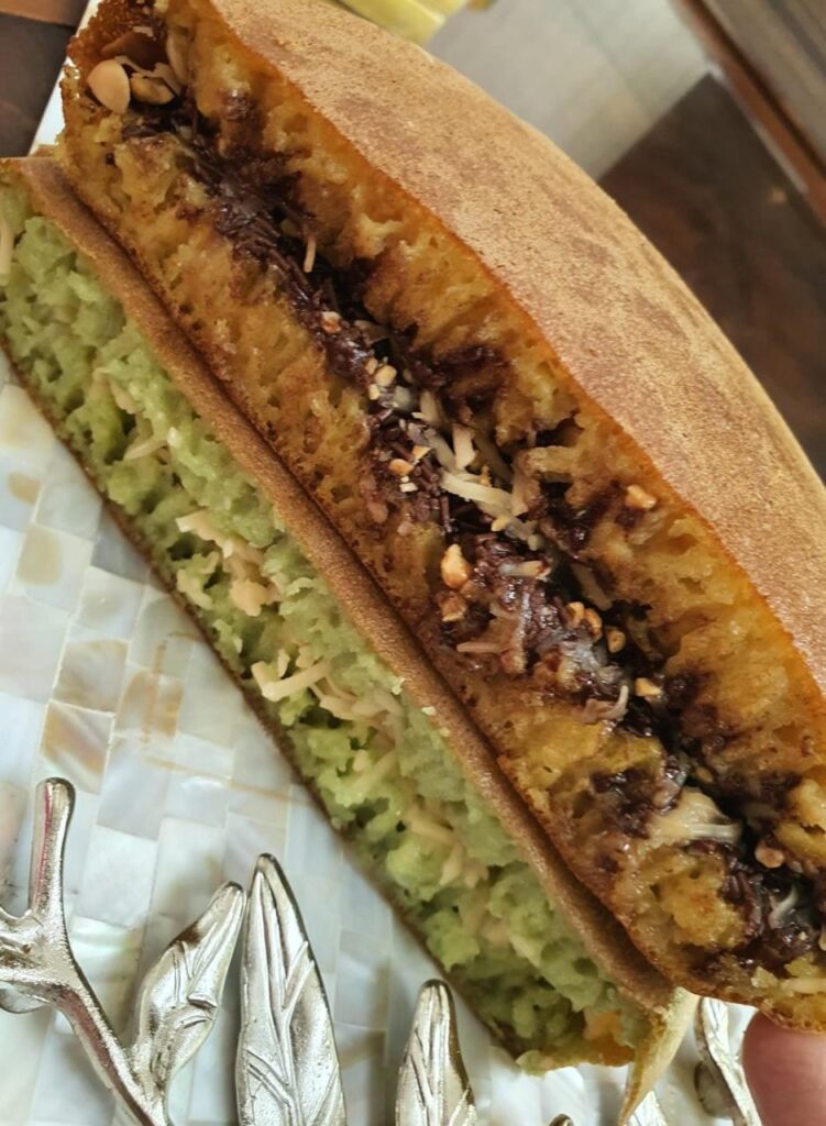 This is a decadant dessert. Easy to make. Just a little tricky. The texture will be spongy and with visible strands. But satisfaction is guaranteed π. Be generous with the fillings. The trade mark strandy texture, comes from cooking at right temperature. Hope you all will like it and try making Martabak Manis.