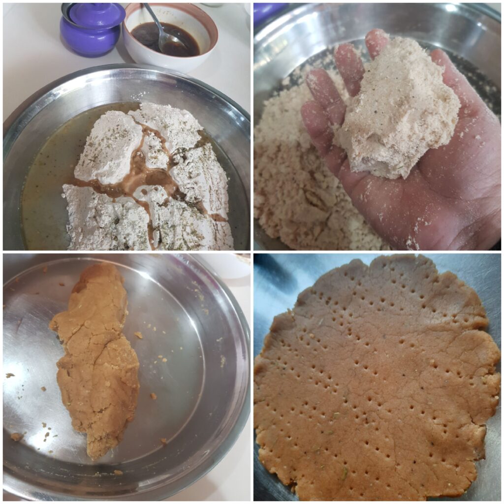 - And add the oil, add 5 tbsps first and mix with finger tips. If you can gather the flour in your hands like a ball, that means oil is enough otherwise add 1 tbsp more.