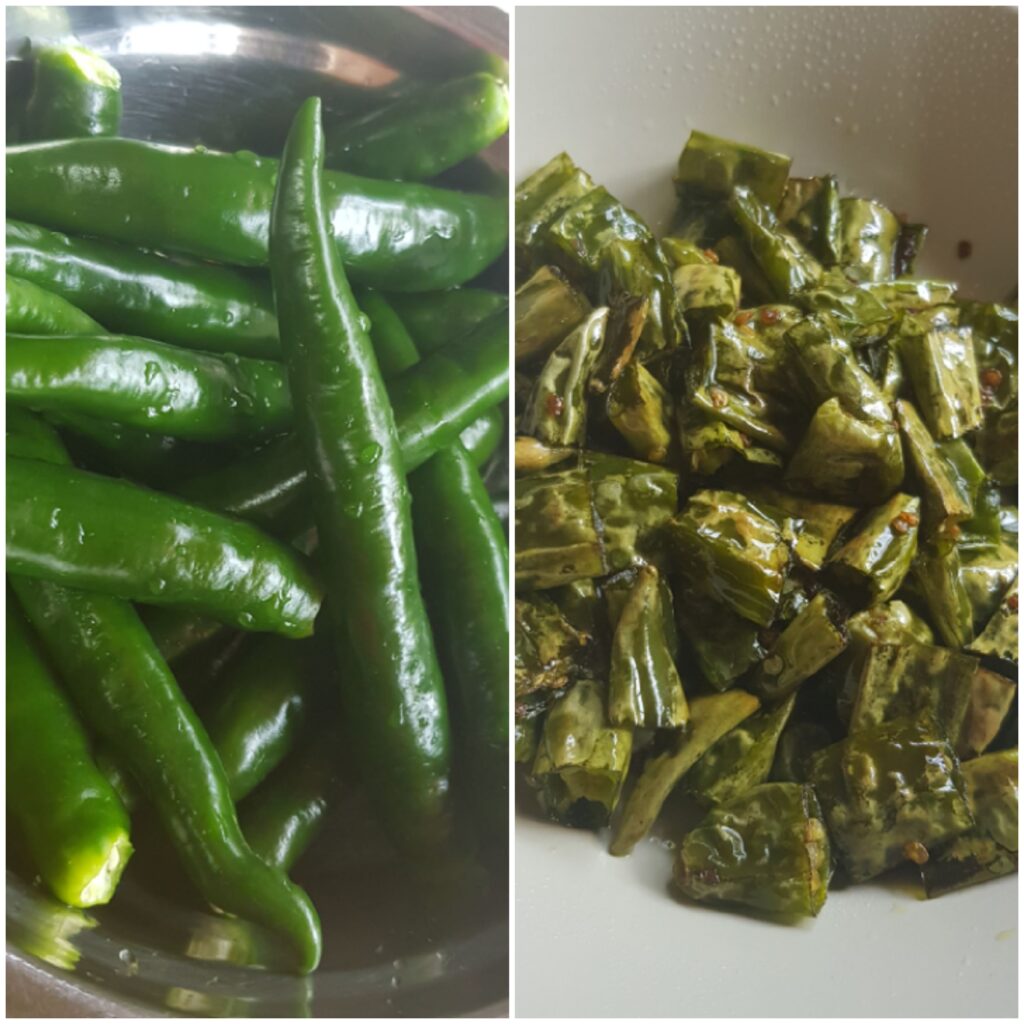 - Heat about 4 to 5 tbsps oil in a pan, add cut chillies, and saute till the chillies turn white. Drain and reserve the oil.