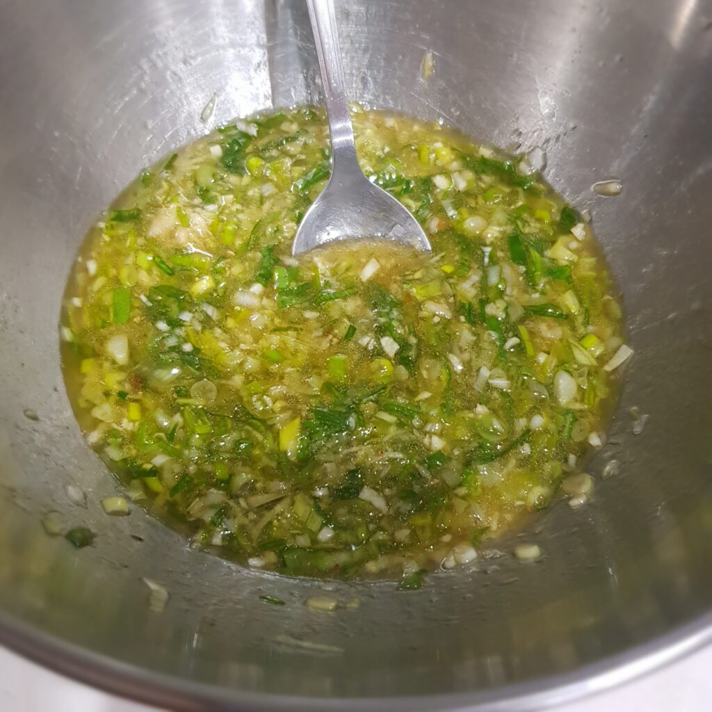 - In a bowl, add 5 stalks of chopped spring onion, 2 cloves of finely chopped garlic, and 1 inch piece of grated ginger.