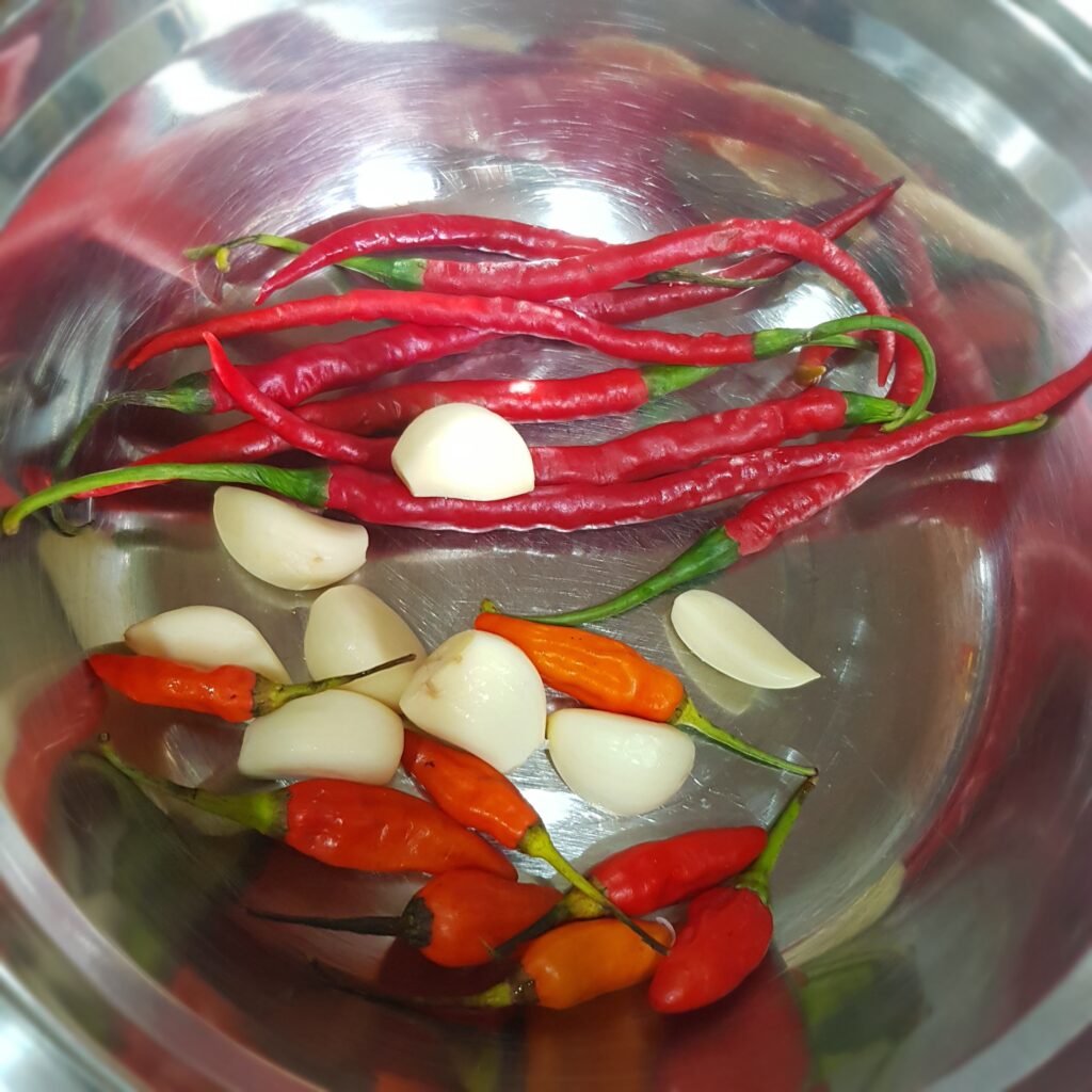 - Blend together 8 curly red chillies, 8 birds eye chillies, 6 cloves of garlic, 1 tbsp sugar, 1 tbsp salt, and 100ml water.