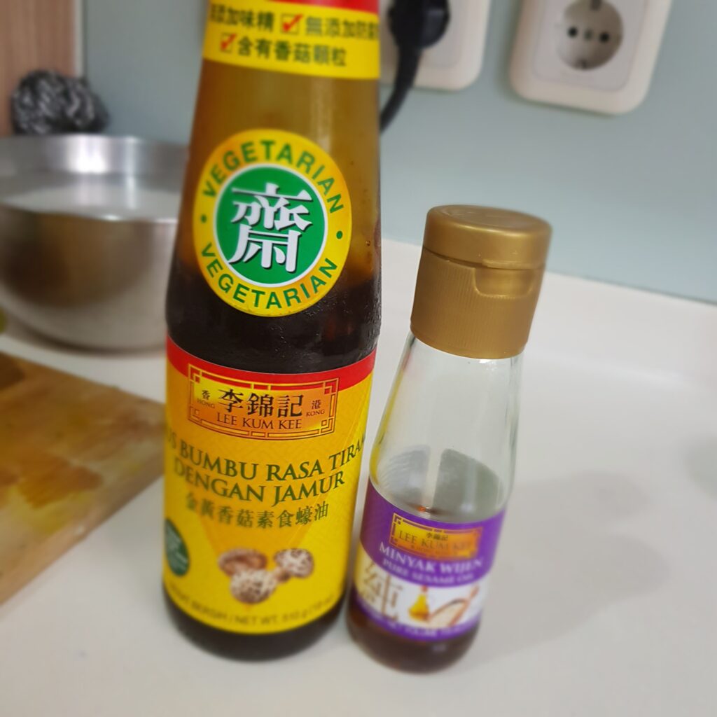- Add 1 tbsp sesame oil, 1 tbsp oyster sauce (vegetarian version is fine), 1 tsp sugar, 1 tsp salt, and 1 tsp white pepper.