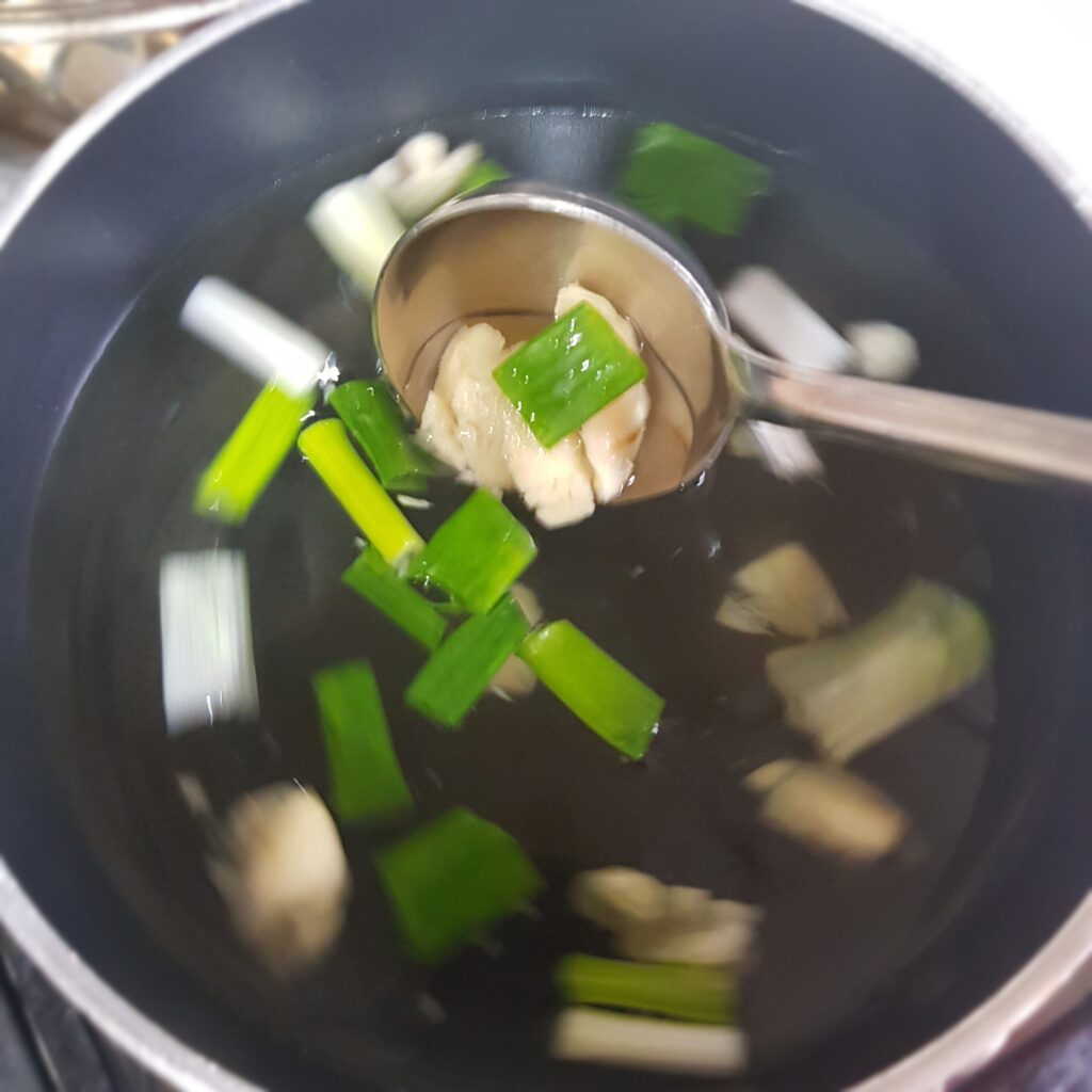 - Add 1 tbsp normal oil, 1 tbsp sesame oil, 1 tbsp oyster sauce, 2 tbsp soy sauce, 2 tsps salt, 1 tsp pepper, and 2 stalks of spring onion cut into big pieces.