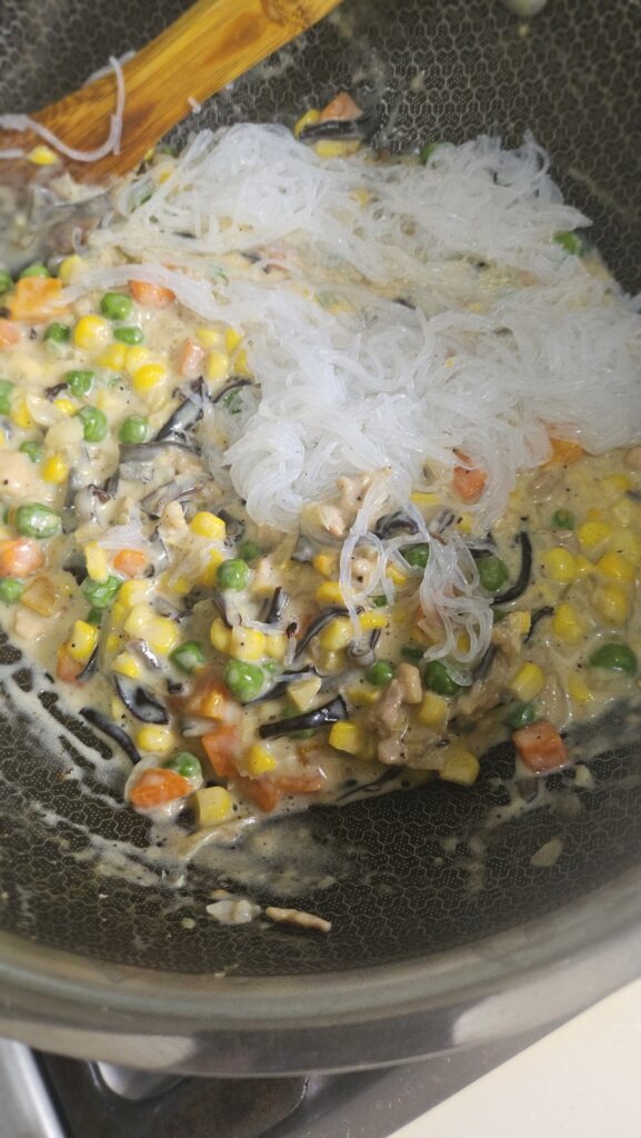 Add boiled egg, rice vermicelli, salt, pepper, stock powder, nutmeg, and cheese.