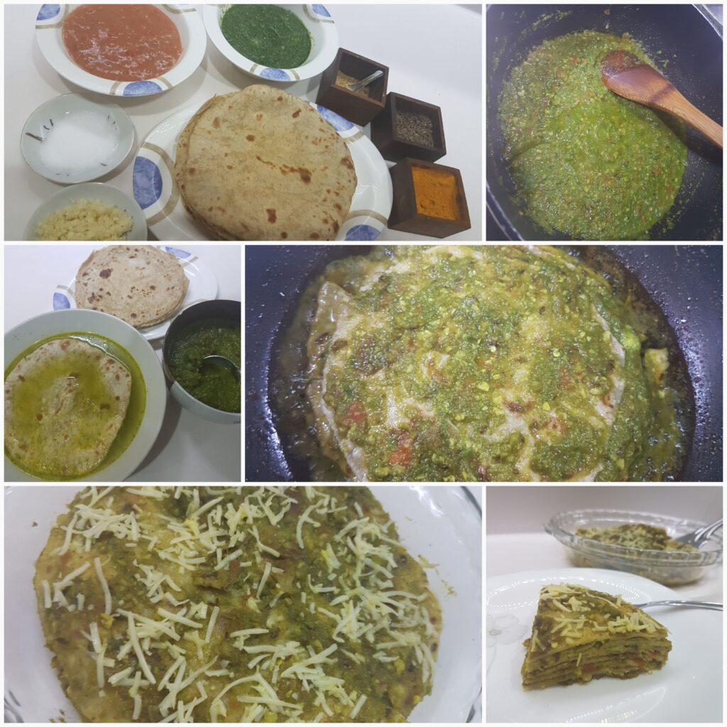 Green masala paste or an onion-based gravy is cooked and either bread or rotis are added to the simmering gravy and allowed to soak up the masala. The normal procedure would be to tear up the chappatis into pieces and add them to boiling gravy and cook till the liquid evaporates, which would be within a few minutes. But my mother-in-law made this dish in a unique way, stacking the chappatis or bread with thick gravy between layers and building it up into a layered cake. A little extra effort and a pretty-looking dish was ready to be served, resembling an Italian lasagna but made with fewer ingredients.