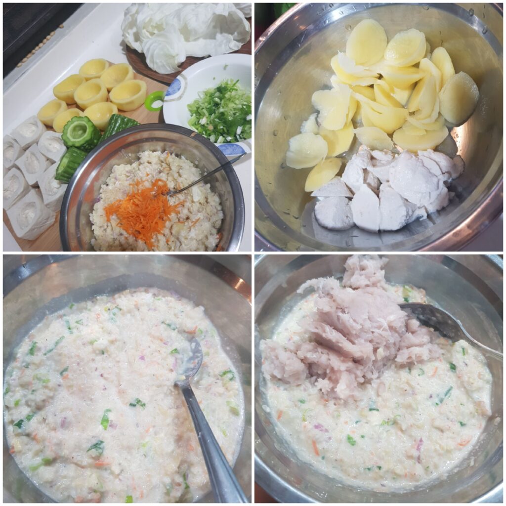 - Mix fish paste, potato, tofu, and 1/4th cup grated carrot in a bowl. Add finely chopped spring onions and celery, season with salt, pepper and msg (optional).