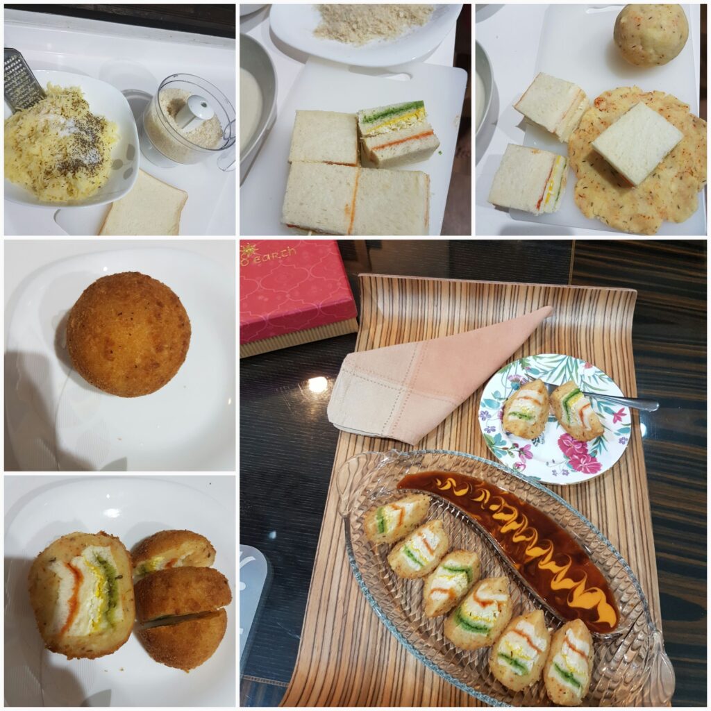 - Take one part of the potato mix and flatten it on the palm of your hand. It should be as big as your palm. Put one piece of the sandwich in the centre and bring the potato mix over it to cover the sandwich completely. Work it into a tight round ball, pressing gently as you go. Make the remaining balls the same way.