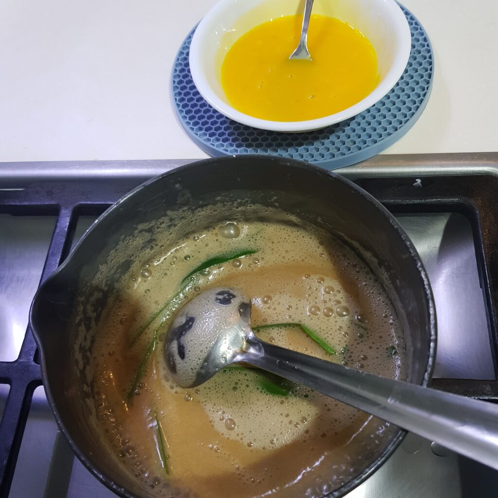 - Once the mixture is thicker, remove half cup of the hot coconut milk mixture and add to the yolks (to temper) and mix quickly.