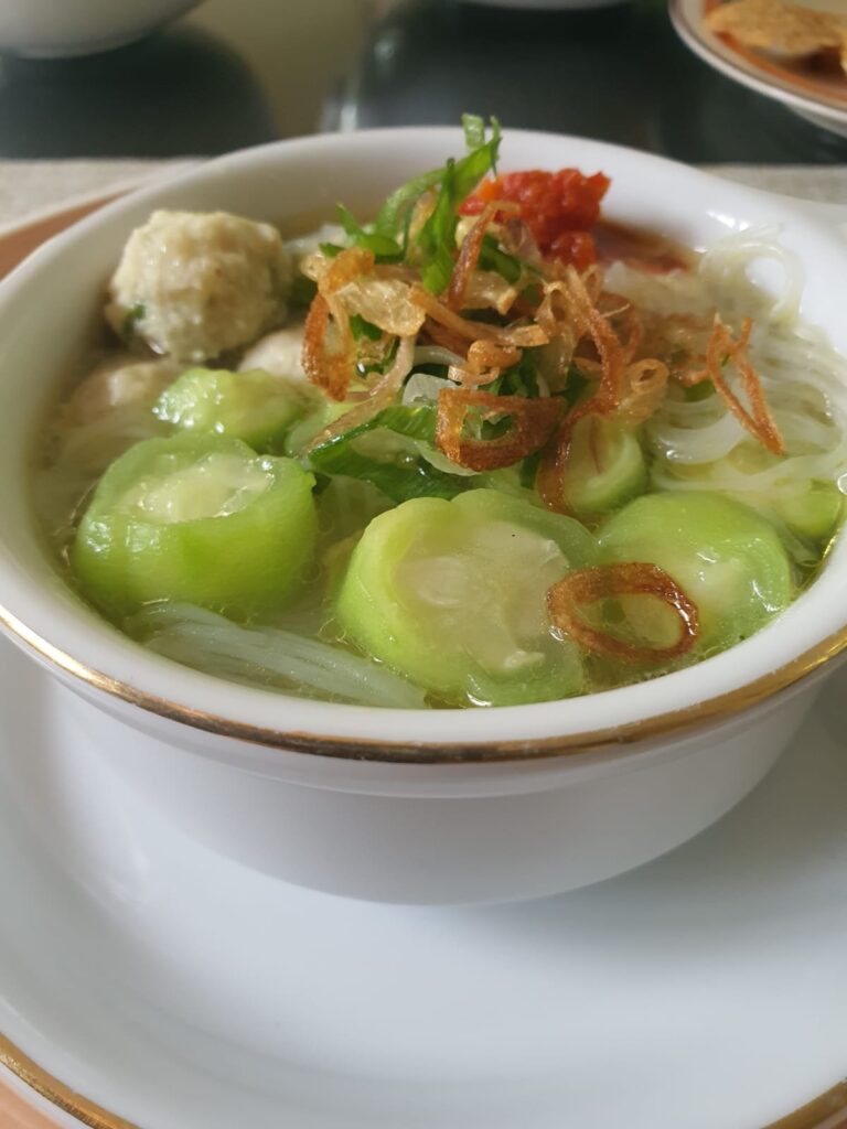 This is one of the best ways to eat this lovely vegetable. Adding Ridgegourd to soup gives it a silken texture and surprisingly it enhances the taste. One of our favourite soups at home, especially on a rainy night. Indonesians are not familiar with cooking Turaiya in a sabji form; it is mostly made this way in a soup. Do try this soup, which is very very easy to make and a delight to have—a meal in a bowl. I love Turaiya in any form, be it the aisi turiyuoon ji bhaji which my mother made often when we were young or even the phota bhuga turi which my mother in law gave me during child birth.