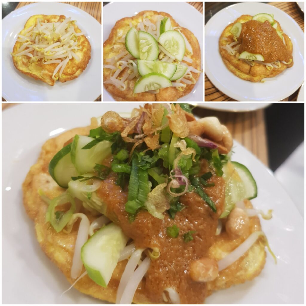 7. Slide onto a serving platter. Top with cucumber, beansprouts, peanut sauce, celery leaves, spring onions, fried onions, and some fried peanuts.